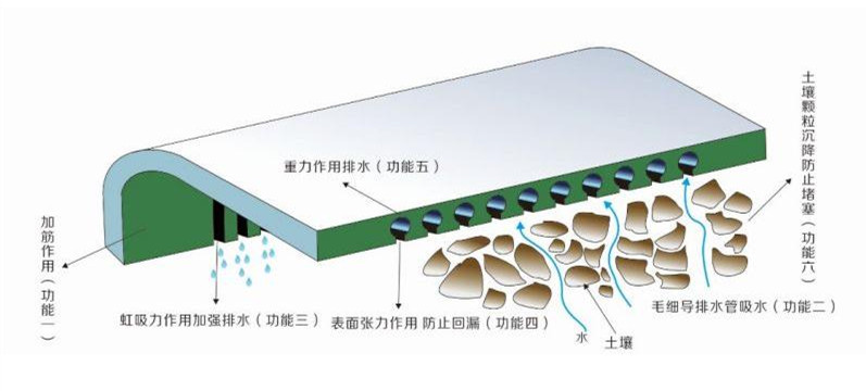本產品采用PVC高密度聚合材料,具有較好的韌性,埋于土中可以起到拉結土壤的作用(功能一);且一反傳統改采用密集溝槽,內大外小的設計,且埋設時溝槽面向下,而使水流由下往上倒吸進入毛細導水管(功能二);如此一來土壤顆粒因重力自然沉淀不致隨同水流進入毛細導水管內,同時也不會在進水槽溝附近產生淤積現象(功能三);但是內部溝槽既能進水,同時也造成漏水之后果,此時毛細防排水板則利用表面張力使水在溝槽上產生封閉效果不回漏(功能四);當水進入時,毛細現象會自然而然對土壤中的水分產生抽吸的效果,直到灌滿并以重力流向外排放(功能五);當水流到達出口將因落差產生虹吸作用,進一步對土壤內部產生負壓,大幅增加吸排水效果(功能六)。